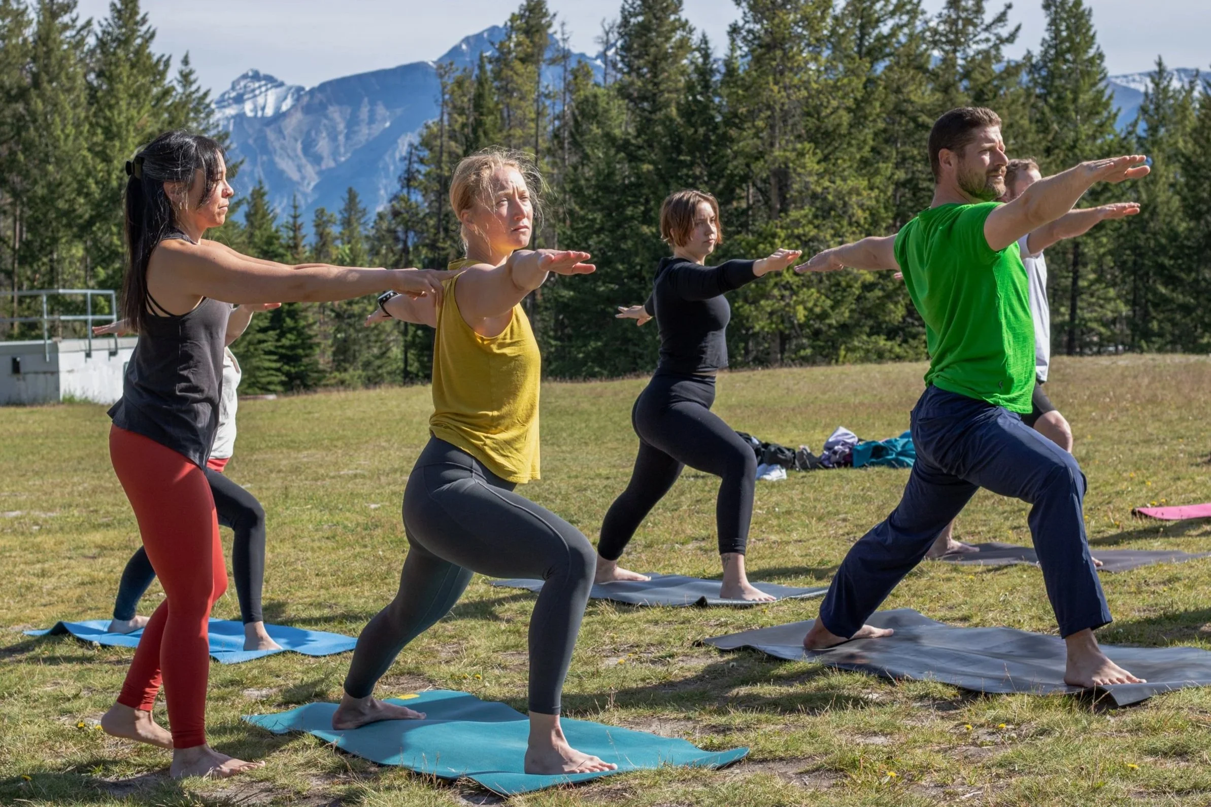 • A gentle, nourishing, and all-levels yoga session at an outdoor location close to Banff town, overlooking lush forest and scenic mountains.